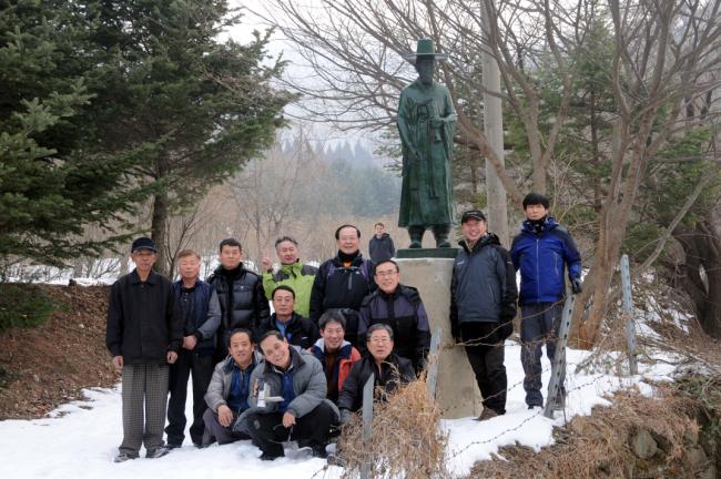 천진암 성지, 매년 첫번째로 순례오는 단체 순례객(서울, 암사동성당 나눔회 20명 외), 조선교구 설립자 정하상 성인 상앞에서 단체 기념 사진