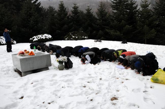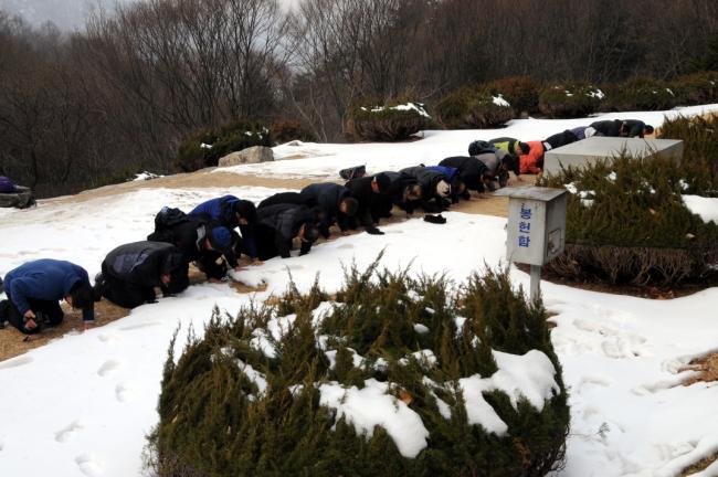 천진암 성지, 매년 첫번째로 순례오는 단체 순례객(서울, 암사동성당 나눔회 20명 외), 조선교구설립자 묘역을 거쳐 한국천주교회창립성현 5위 묘에서 큰절