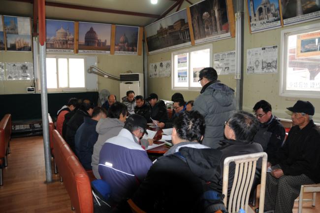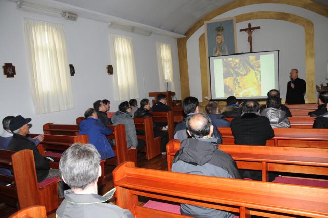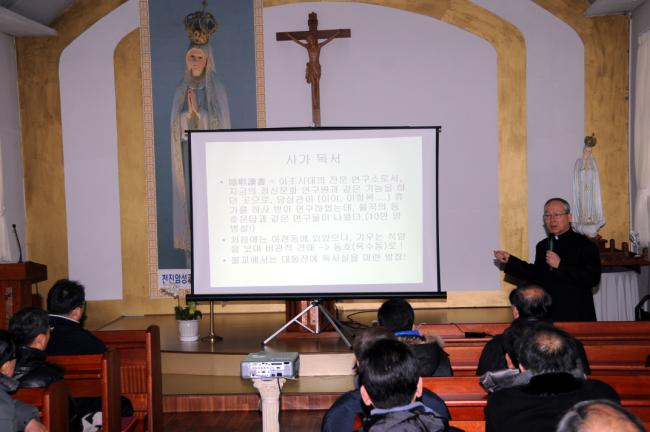 천진암 성지, 매년 첫번째로 순례오는 단체 순례객, 주일 낮 12시 미사(서울, 암사동성당 나눔회 20명 외)후, 주임 김학렬 신부님의 천진암 강학