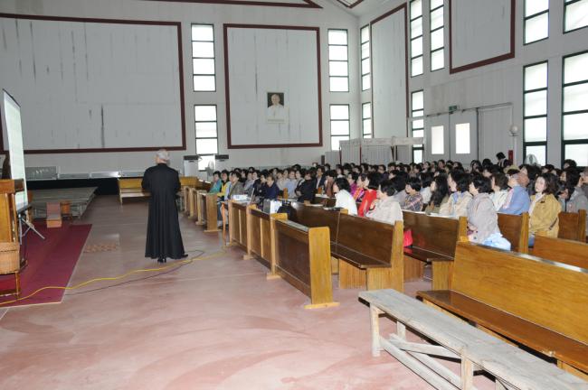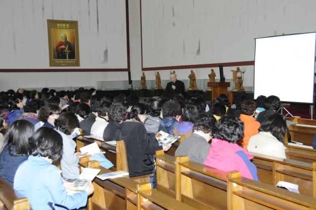 대전, 전민동 성당 버스4대 150명, 천진암 성지순례시, 12시 순례객 미사 전, 성지 주임 김학렬 신부님의 천진암 강학(2013.04.26)