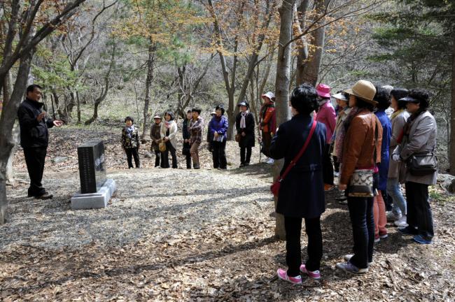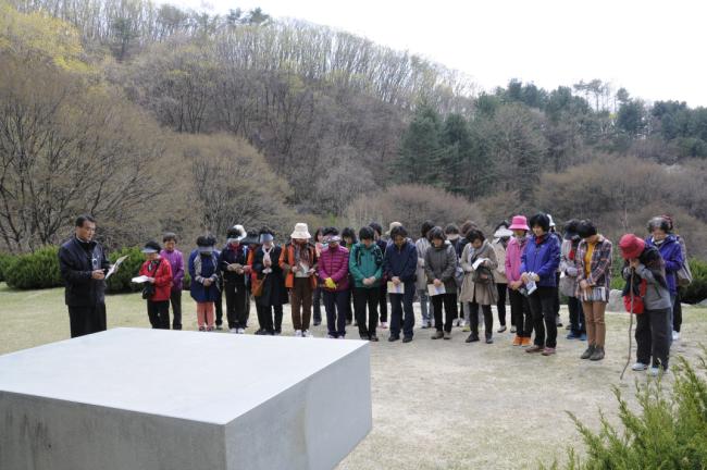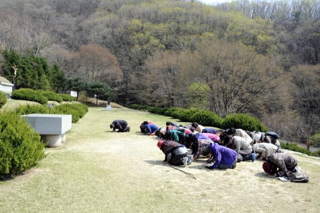 대전, 전민동 성당 버스4대 150명, 천진암 성지순례, 한국천주교회 창립성현 5위 묘 참배 후, 큰절을 하고 있다.(2013.04.26)