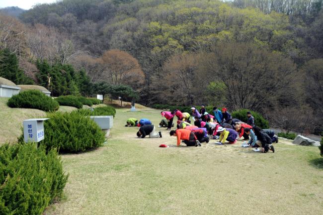 광주대교구, 나주성당 33명 외 천진암 성지 순례, 한국천주교회 창립성현 5위 묘 참배 후, 큰절을 하고 있다.(2013.04.27)
