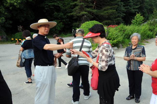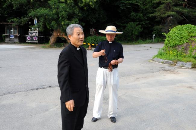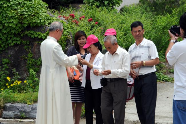 대만, 타이베이교구 박규우 신부님과 신자들 성지순례, 성지 주임 김학렬 신부님이 선물로 묵주를 나누어 주고 있다(213.06.20)