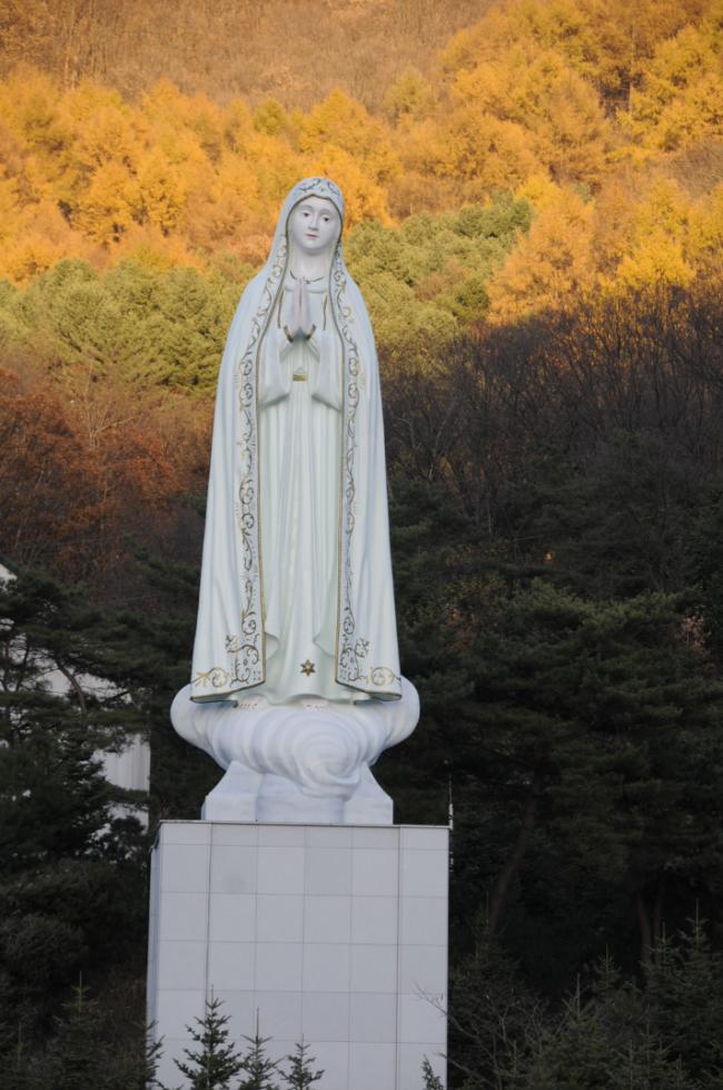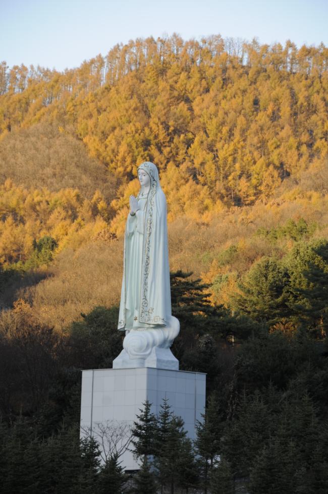13년 11월 18일, 첫눈과 대성당 터, 저녁노을속의 세계 평화의 성모상(오후 4시 44분)