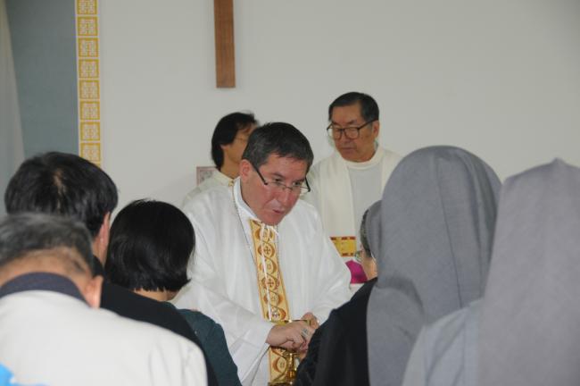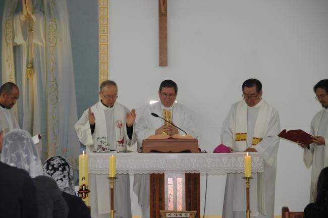 페루교구 주교님과 수원교구 선교사 신부 2명, 대만 화련교구 마데 수녀회 17명, 천진암 성지 순례, 낮 12시 순례객 미사 중 변기영 몬시뇰 통역(2014.04.29)