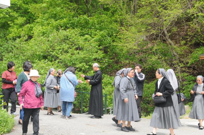 페루교구 주교님과 수원교구 선교사 신부 2명, 대만 화련교구 마데 수녀회 17명, 천진암 성지 순례, 낮 12시 순례객 미사후, 성지 주임 김학렬 신부 대만 수녀들에게 묵주선물을 주고 있다(2014.04.29)