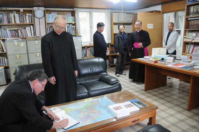 페루교구 주교님과 수원교구 선교사 신부 2명, 대만 화련교구 마데 수녀회 17명, 천진암 성지 순례, 낮 12시 순례객 미사 후, 한국천주교회창립사연구원에서 방명록 기록(2014.04.29)