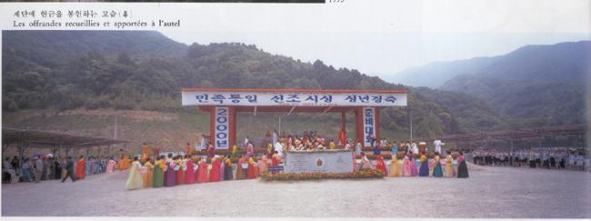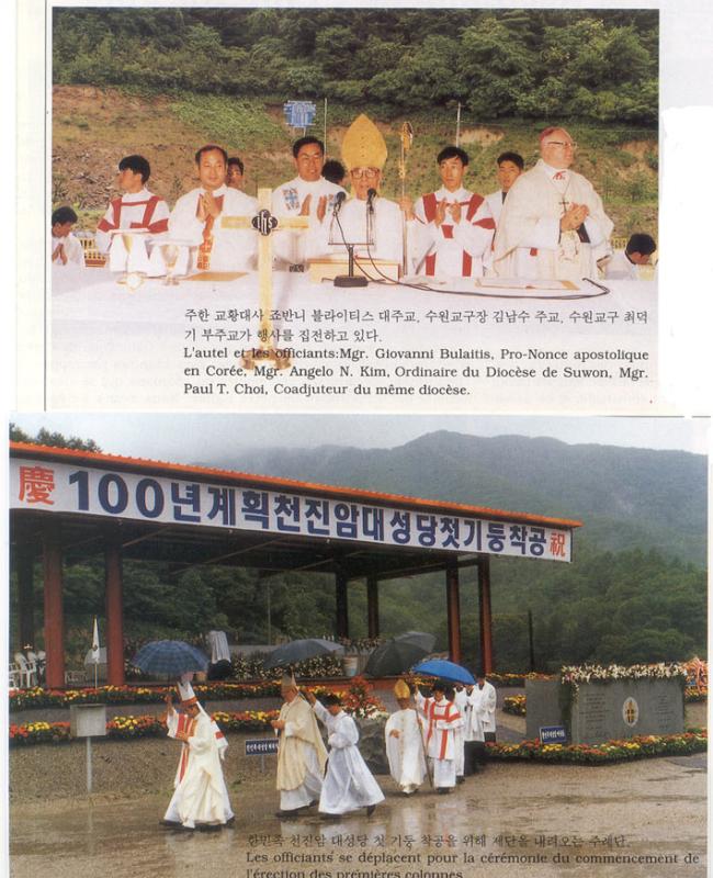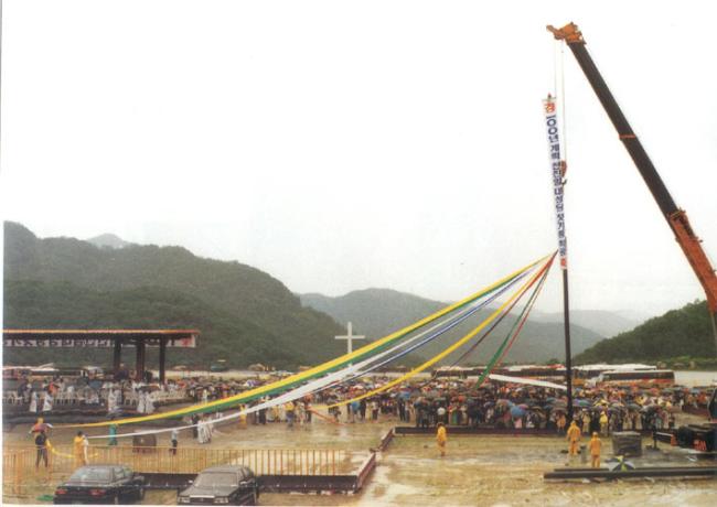 1996년 6월 24일(1779-1996)오전 11시, 한국천주교회창립제217주년 기념식과 한민족100년계획천진암대성당 첫 기둥 착공식을 동편에서 본 광경(위)과 한민족 천진암대성당 첫 기둥의 뿌리를 박는 5색 명주끈(30M)을 주례단, 내빈, 신자대표들이 함께 당기고 있다(아래).