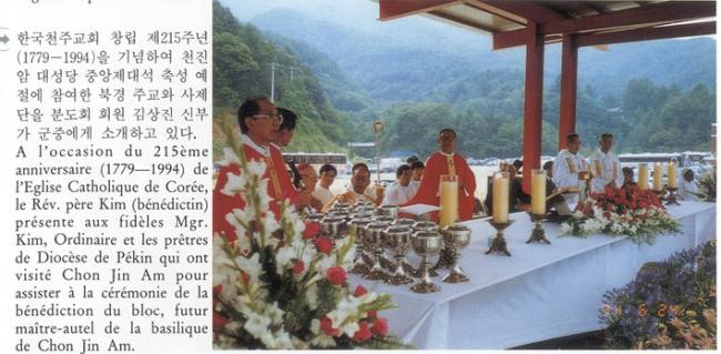 한국천주교회 창립 제215주년(1779-1994)을 기념하여 천진암대성당 중앙제대석 축성 예절에 참여한 북경 주교와 사제단을 분도회 회원 김상진 신부가 군중에게 소개하고 있다.
