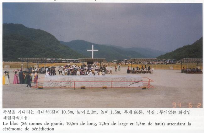 한국천주교회 창립 제215주년(1779-1994) 기념 행사시(100년계획천진암대성당 중앙제대석 축성), 축성을 기다리는 제대석(길이 10.5M, 넓이 2.3M, 높이 1.5M, 무게 86톤, 석질: 무늬없는 화강암 세립자석).