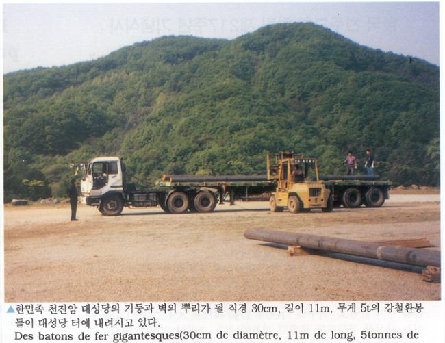1996년 6월 24일(1779-1996)오전 11시, 한국천주교회창립제217주년 기념식과 한민족100년계획천진암대성당 첫 기둥 착공식 행사에서 대성당의 기둥과 뿌리가 될 직경 30센티미터, 길이 11M, 무게 5t 강철환봉들이 대성당 터에 내려지고 있다.