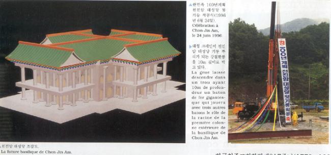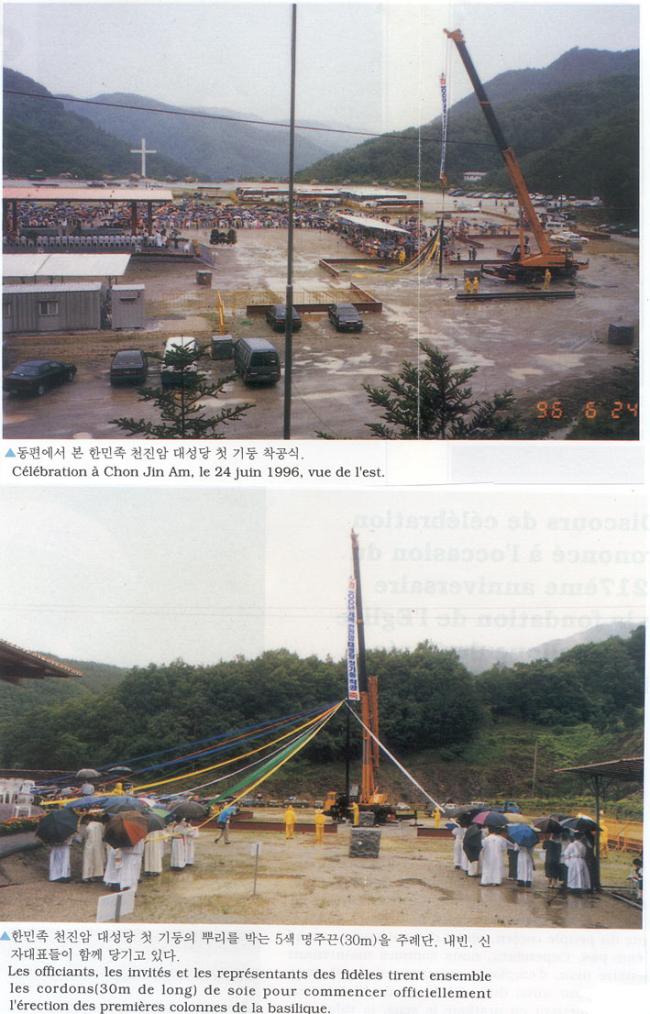 1996년 6월 24일(1779-1996)오전 11시, 한국천주교회창립제217주년 기념행사시, 천진암대성당 조감도(좌)와, 대형 크레인이 천진암대성당 기둥 뿌리가 되는 강철환봉을 10M 깊이로 박고 있다.