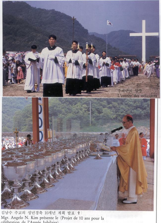 1995년 6월 25일(1779-1995)오전 11시(제216주년), 한국천주교회 창립 제216주년 기념 행사시 주례단의 입장(위)과 김남수 주교의 성년경축 10개년 계획 발표(아래).