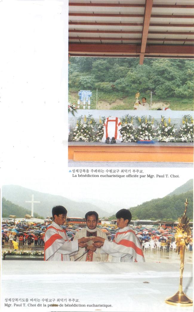 1996년 6월 24일(1779-1996)오전 11시, 한국천주교회창립제217주년 기념행사시, 성체강복을 주례하는 수원교구 최덕기 부주교(위), 성체강복기도를 바치는 수원교구 최덕기 부주교(아래).