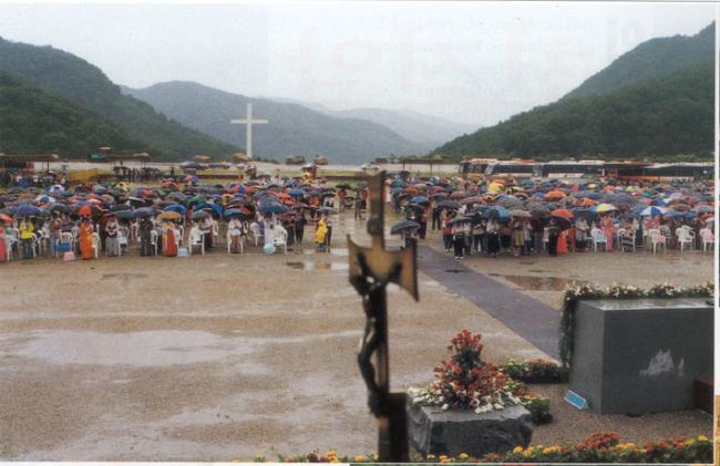 1996년 6월 24일(1779-1996)오전 11시, 한국천주교회창립제217주년 기념식과 한민족100년계획천진암대성당 첫 기둥 착공식에 세차게 내리는 비 속에서도 의연한 모습의 신자들