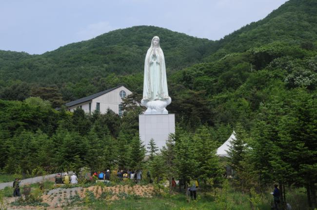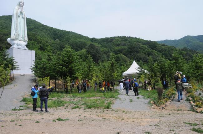 서울, 중계동성당 꾸리아 111명, 천진암 성지 순례, 낮 12시 주일 순례객 미사 후, 세계 평화의 성모상 앞에 모여서 묵주의 기도를 바치고 있다.(214.05.18)