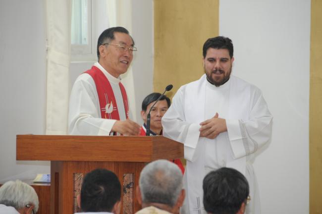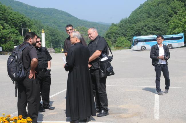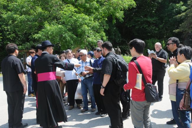 臺灣, 高雄敎區, 黃副主敎外 神父13名, 敎友12名, 天眞菴 聖地 巡禮(대만, 고웅교구, 황부주교외 신부13명, 교우12명, 2014.05.22), 성지주임 김학렬 신부, 천진암성지 묵주를 기념으로 나누어 주고 있다.