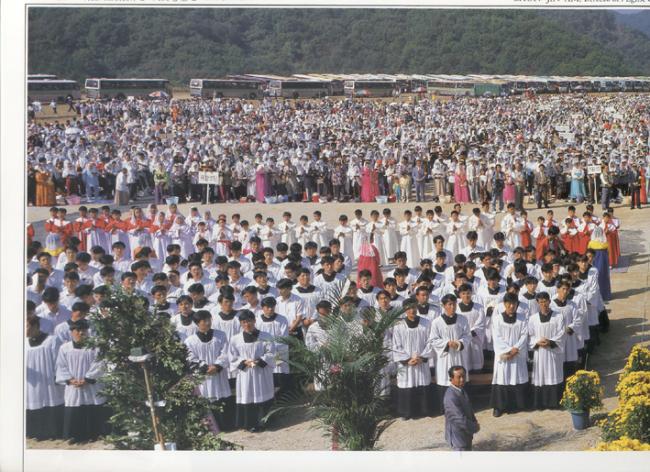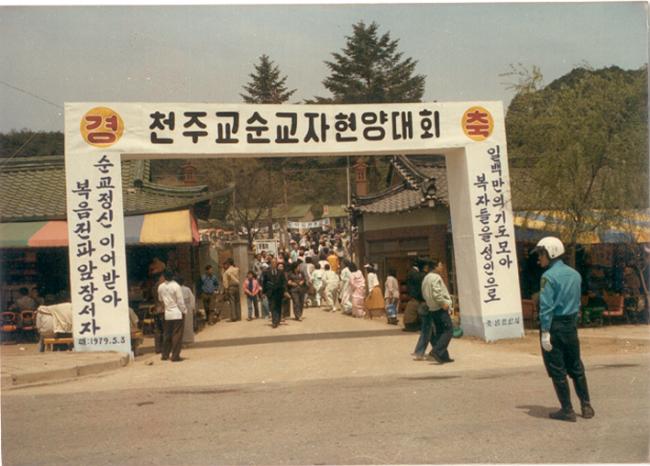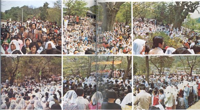 1979년 5월 3일 오전11시, 한국천주교회 발상지 천진암 순례 및 남한산성 순교자 현양대회 행사시 순교자의 직계 후손들과, 한국천주교회 창립에 직접 참여한 유공자들의 직계 후손(맨 윗 왼쪽사진)들과 제대 동서남북을 가득메운 신자들(제1회 한국천주교회 창립기념 행사, 이때는 천진암성지에 진입로가 없었서 남한산성에서 거행함).