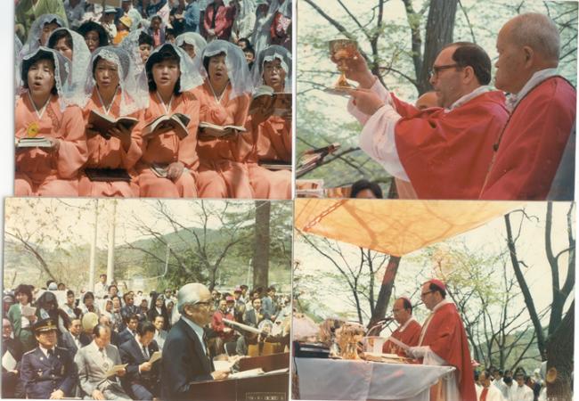 1979년 5월 3일 오전11시, 한국천주교회 발상지 천진암 순례 및 남한산성 순교자 현양대회 행사시 잠실본당의 어머니의 성가대 일부(위, 좌), 순교자들의 피로 물든 이 골짜기에서 최초로 봉헌되는 그리스도의 성혈(위, 우), 한국천주교회 기원사와 천진암 강학회를 설명하는 류홍렬 박사(아래, 좌), 강론하는 교황대사와 통역하는 김남수 주교(아래, 우), 제1회 한국천주교회 창립기념 행사, 이때는 천진암성지에 진입로가 없었서 남한산성에서 거행함).