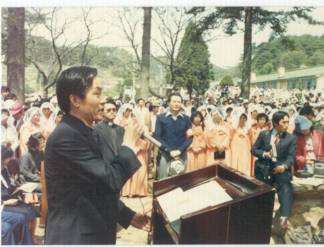 1979년 5월 3일 오전11시, 한국천주교회 발상지 천진암 순례 및 남한산성 순교자 현양대회 행사시 개회사를 하는 변기영 신부. 온갖 모진 형벌과 굶주림을 이기고 칼아래 목을 느려 피를 뿌리고 쓰러져가면서도 진리를 증언하던 순교자들에게 영광을 드리자!!(제1회 한국천주교회 창립기념 행사, 이때는 천진암성지에 진입로가 없었서 남한산성에서 거행함).