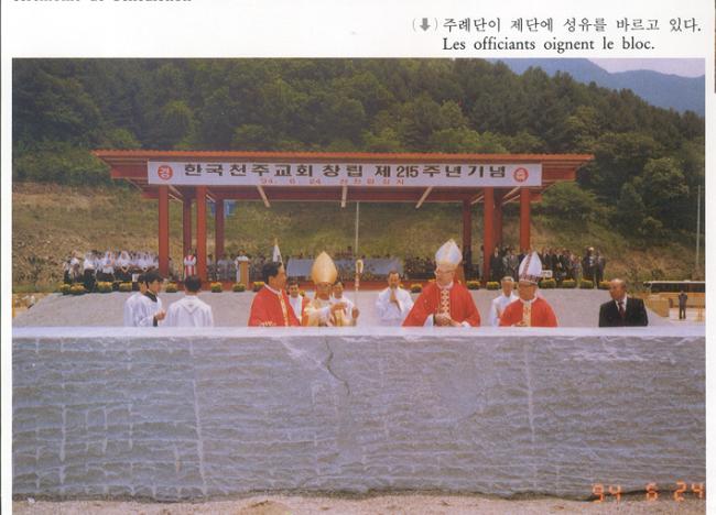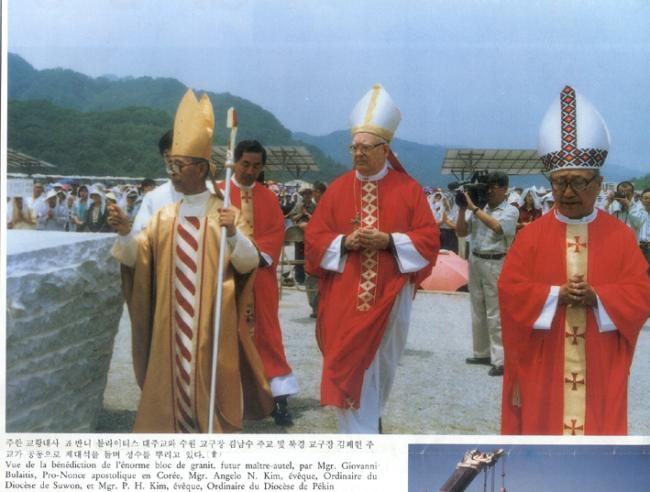 한국천주교회 창립 제215주년(1779-1994) 기념 행사시(100년계획천진암대성당 중앙제대석 축성), 주한 교황대사 죠반니 블라이티스 대주교와 수원교구장 김남수 주교 및 북경 교구장 김폐헌 주교가 공동으로 제대석을 돌며 성수를 뿌리고 있다.