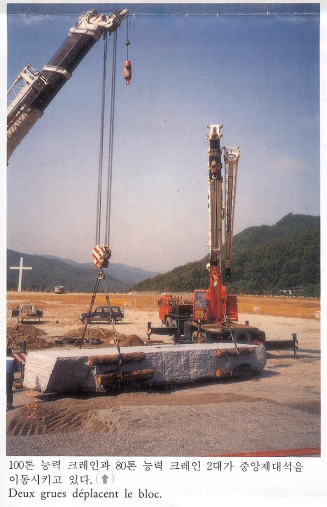 한국천주교회 창립 제215주년(1779-1994) 기념 행사시(100년계획천진암대성당 중앙제대석 축성), 100톤 능력 크레인과 80톤 능력 크레인 2대가 중앙제대석을 이동시키고 있다.