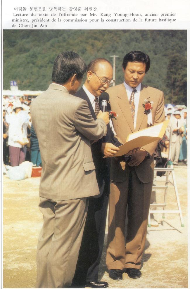 1993년 9월 26일 오전 11시, 한국천주교발상지 천진암성지에서 한민족 100년계획 천진암대성당 건립 정초식 행사시, 머릿돌 봉헌문을 낭독하는 강영훈 위원장.