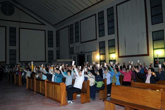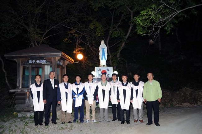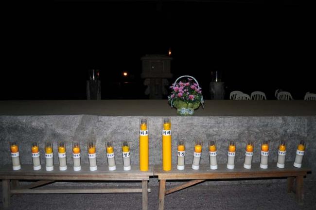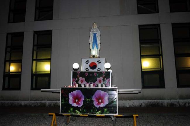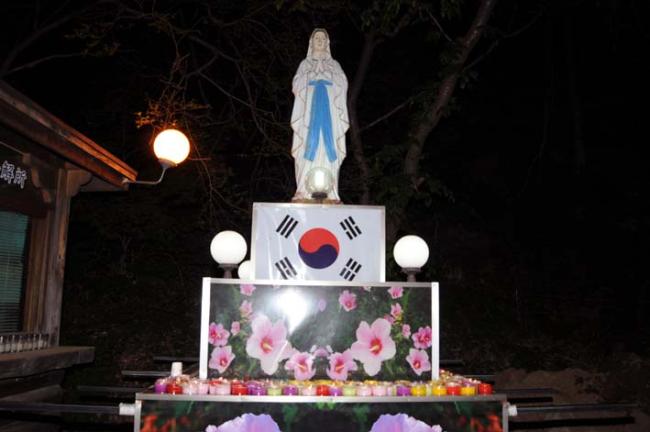 천진암성지의 제122회 월례 촛불기도회 후 개인의 초를 성모상에 봉헌한 모습(08.05.03, 토)