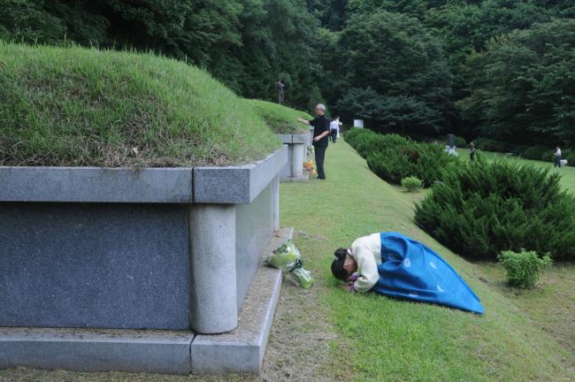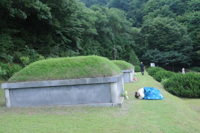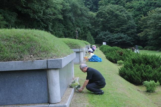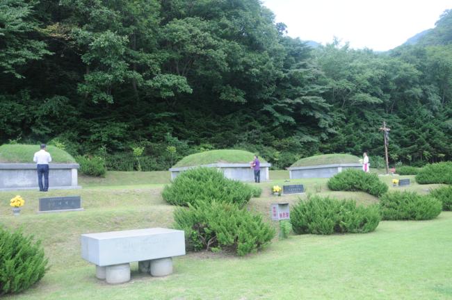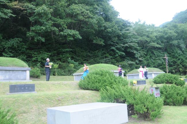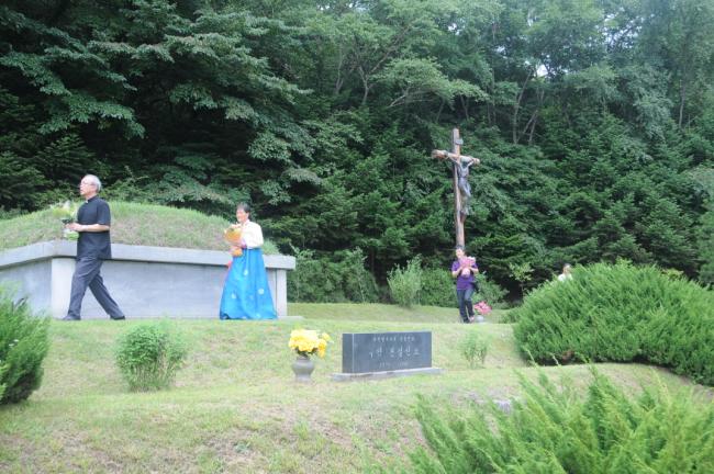 오늘 정약종 아우구스티노 성현(프란치스코 교황 성하, 윤지충 바오로와 동료 123위, 광화문 광장 시복 미사 집전)시복 경축, 천진암 성지 변기영 몬시뇰과 성지주임 김학렬 신부님, 이벽성조 후손인 이재형 회장, 성지직원들이 5위 성현묘 참배 후 꽃다발 헌화(2014.08.16)