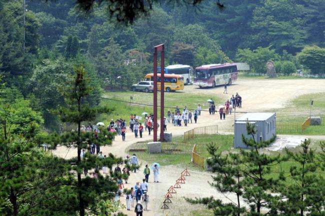 천진암 성지에 순례 온 순례객이 12시 미사참례하러 성모성당을 향해 가고 있다(대구국우성당 버스4대 150명, 서울 용산 버스1대40명, 서울 화곡동 버스1대 22명, 부천 삼정동 버스1대23명 외 08.06.08)