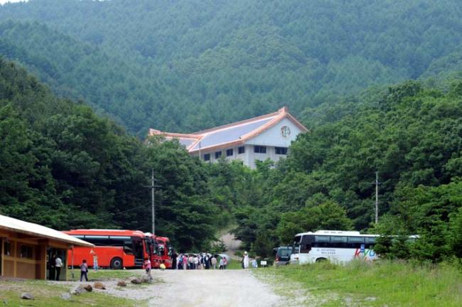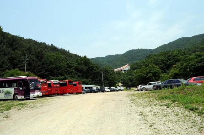 성지 순례객 차량(대구국우성당 버스4대 150명, 서울 용산 버스1대40명, 서울 화곡동 버스1대 22명, 부천 삼정동 버스1대23명 외)과 천진암박물관 동판기와 공사가 완공된 모습이 저멀리 보이고 있다.(08.06.08)
