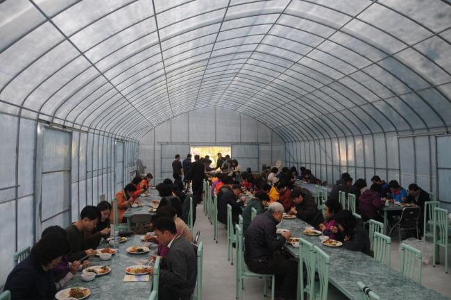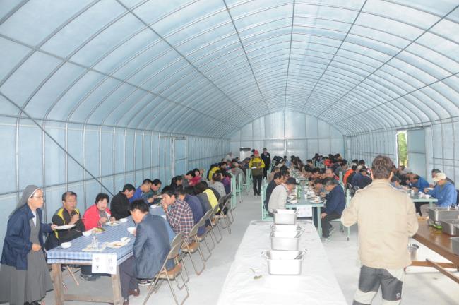 인천, 가두선교단 37명, 수원, 용인 신봉동성당 성가대 14명, 동수원 성당 예비자 10명, 천진암성지 순례, 낮12시 미사 후, 식사를 하고 있다(2014.10.25).