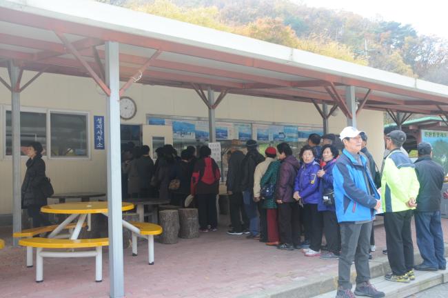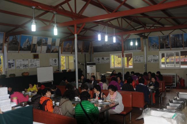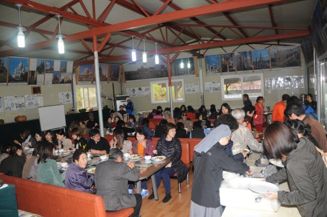 청주, 봉방동성당 40명, 서울, 반포4동성당(장경근 신부) 수험생자모회 48명, 천진암성지순례, 낮 12시 순례객 미사 후, 식사를 하고 있다.(2014.10.30)