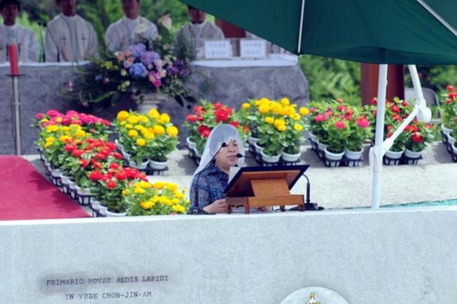 한국천주교회창립기념제229주년(30회)기념행사시 신자들의 기도를 하는 주 세실리아자매(신학생170명, 사제단 17명, 신자 수 2,500여명 참석)08.06.24.화