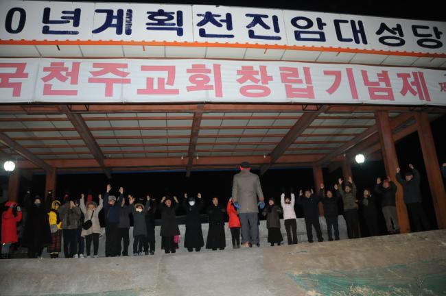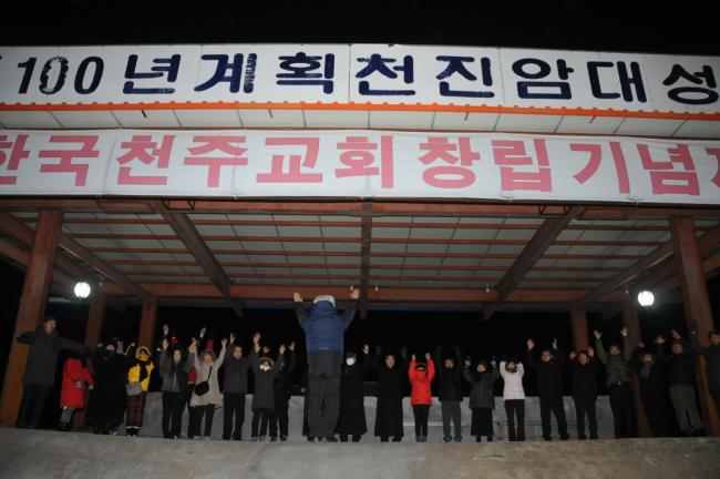 새해맞이 기도후, 천진암대성당터 제단에서 만세12창을 목청껏 부르고있다(대한민국만세3창, 한국천주교회만세3창, 성모마리아님 만세3창, 천진암성지 만세3창, 2014.12.31)