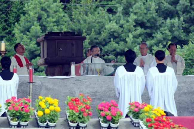 한국천주교회창립기념제229주년(30회)기념행사시 성찬의 전례시 성남 대리구의 김영옥 대리구장 신부님(신학생170명, 사제단 17명, 신자 수 2,500여명 참석)08.06.24.화