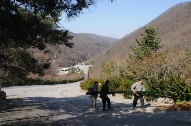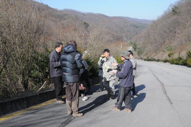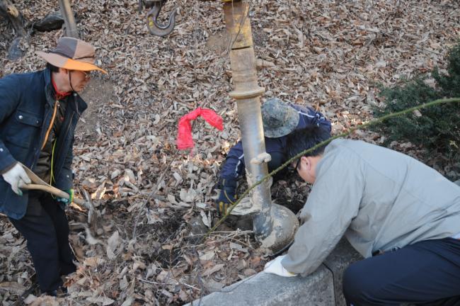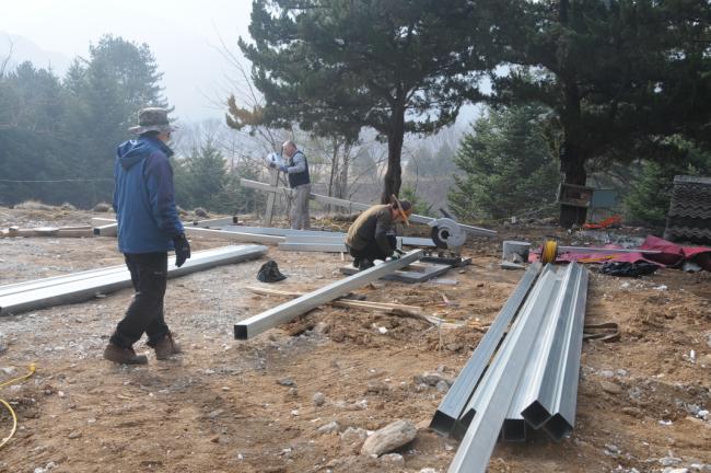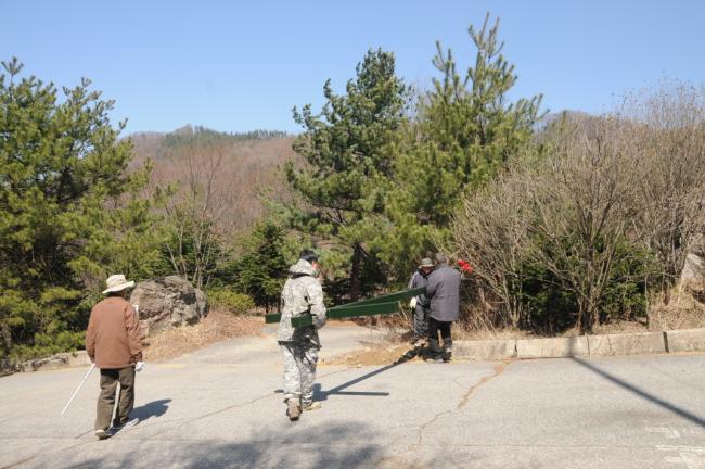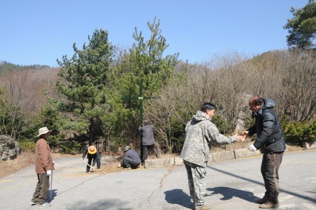 천진암성지 성역로에 14처 설치 공사시, 14처 제작 광명단 페인트 칠(2015.03.18)