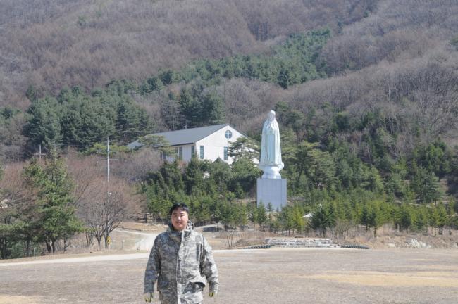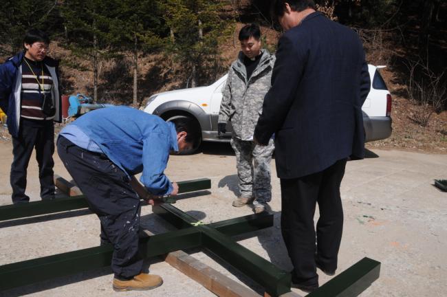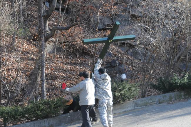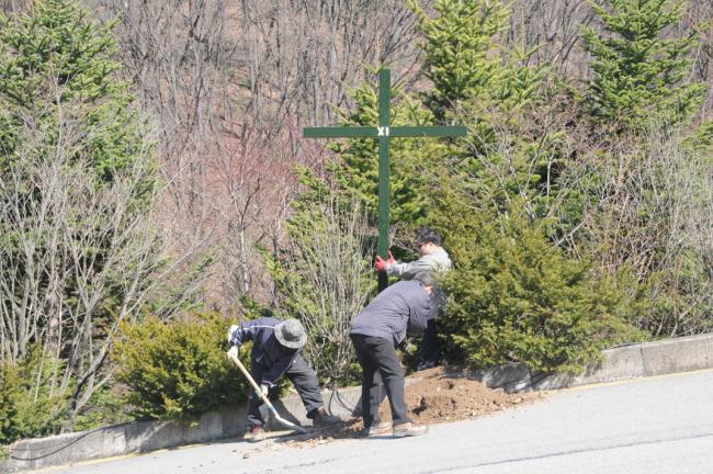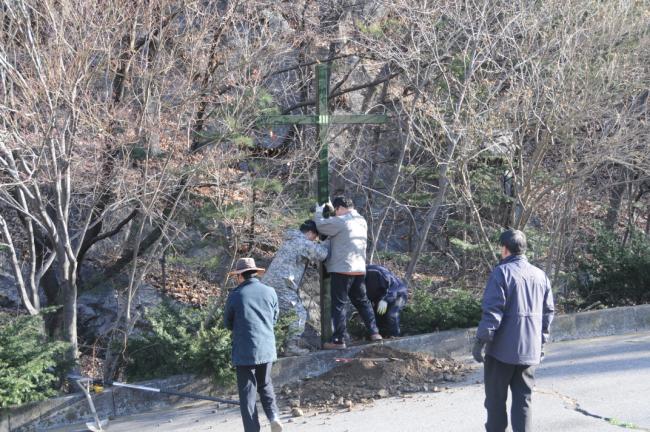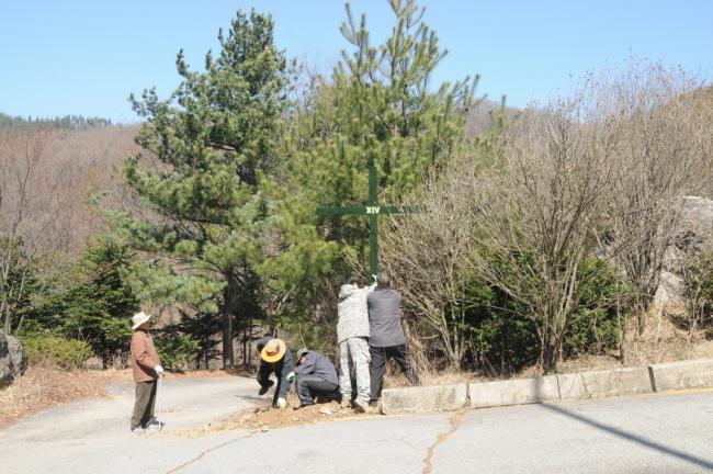 천진암성지 성역로에 14처 설치 공사시, 14처 제작 광명단 페인트 칠 후, 마무리 페인트 칠(2015.03.20)