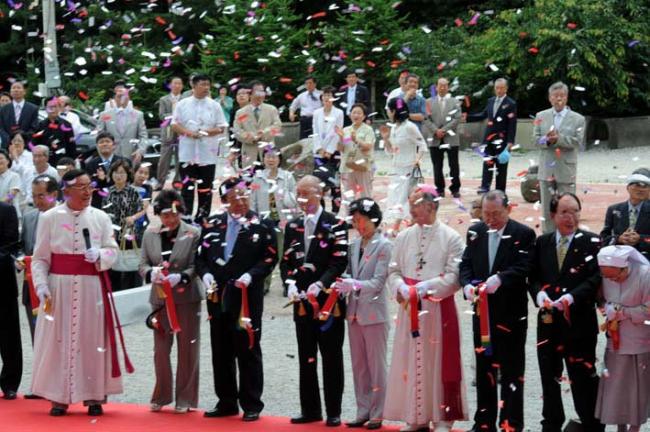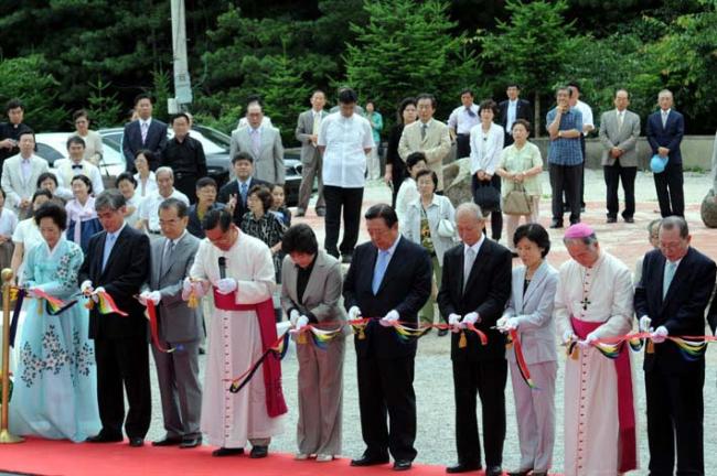 한국천주교회창립기념제229주년(30회)기념행사시, 천진암박물관 외부공사 완공과 다산 정약용 선생의 시문전을 축하하기 위한 테잎 컷팅(신학생170명, 사제단 17명, 신자 수 2,500여명 참석)08.06.24.화