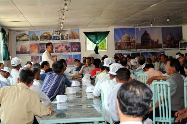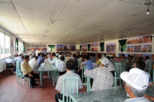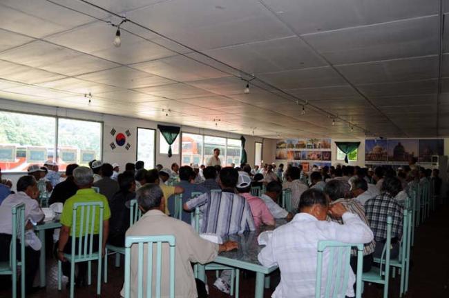 경북 영주, 봉화 지역의 장로님들 153명이 천진암 성지 순례시, 성모경당 아래 전세계대성당 사진전시관 건물에서 변기영 몬시뇰이 한국천주교 발상지 천진암 성지에 대한 특강을 하고 있다(08.06.26)