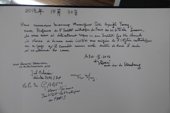 파리 가톨릭신학대학 교수단 일행은, 잊혀져 가던 한국천주교회 창립 성조, 세자요한 이벽 성조를 비롯한 선조들에 대한 박사학위 논문이, 처음으로 파리 가톨릭대학에서 3편(이성배 신부, 김옥희 수녀, 김웅태 신부)이나 나오게 한데 대하여 크게 자랑스럽게 생각한다며 감사의 뜻을 표하였다.