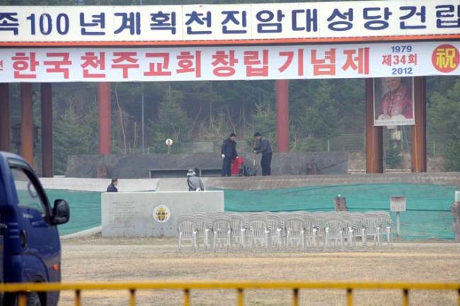100년계획천진암대성당조감도 韓民族 100年計劃 天眞菴大聖堂 建立槪觀 天眞菴大聖堂은 우리겨레를 내시고, 우리나라를 세워주신 하느님과 우리 祖上님들의 恩德에 감사드리기 위하여, 특히 하느님이 保佑하사 우리 後孫들을 보살펴주시고, 우리나라를 지켜주시도록, 그리고 우리나라와 우리겨레를 위하여 眞理와 正義와 愛德을 위해 목숨을 바친 [先祖들 魂靈]의 永遠한 安息과 永福을 위하여, 더욱이 福者 요한 바오로 2세 前 敎皇의 뜻을 따라, [韓民族의 平和統一祈願]의 祭祀를 올리며 祈禱를 바치는 大聖堂입니다. 千年 歲月을 두고, 우리겨레의 얼굴이고, 精神的 依支가 되며, 우리나라의 자랑이오, 守護者가 될, 韓民族 100年計劃 天眞菴大聖堂 建立을 위하여 우리 모두 함께하며, 精誠을 바칩시다 ! 주님의 집으로 가자 할 제, 우리는 몹시 기뻤노라. 주님의 집에 가서 우리 주님께, 우리는 모든 이의 福을 빌겠노라. 주여, 주님의 집은 우리 마음의 그리운 고향이기에, 우리는 주님의 집 생각에, 우리 마음 애태우다 지치나이다. 참새도 새끼 치는 둥지를 틀고, 제비도 제 집을 짓사오니, 우리는 주님의 집을 세우고, 여기서 주님을 찬미하며 감사하리이다. -天眞菴大聖堂建立 祈禱文 중에서- 垈地確保: 10년(1979~1989, 完了). 設計作成: 15년(1980~1995, 完了). 基盤造成: 15년(1985~2000, 98% 完了). 基礎工事: 20년(2001~2020, 50% 完了). 骨組工事: 20년(2020~2040, 資材 確保 中). 外壁工事: 30년(2040~2070, 資材 確保 中). 最終裝飾: 10년(2070~2079), 美術, 彫刻, 配置 草案 設計 中). 天眞菴大聖堂 內部 總工事費: 2010년 現在 物價基準 100年間 1,500억 內外 所要. 整地土工: 1985년 / 建築着工: 1993년 / 敎皇聖下 礎石머릿돌 降福文 下賜 / 祭臺石 祝聖: 1994년. 竣工豫定: 韓國天主敎會 創立 300周年(1779~2079) / 韓國人 出身 로마 敎皇의 祝聖 執典 展望. - 2011. 9. 26. - 韓民族100年計劃天眞菴大聖堂建立委員會 韓民族100年計劃 天眞菴大聖堂 鳥瞰圖 천진암대성당의 평면도 內廣: 1층 內外 平面 4,500坪, 2층 內外 平面 1,000坪, 天井中央, 直徑 50m 半球形 돔. 外長: 東西 195m, 南北 175m. 外高: 추녀 50m, 용마루 85m. 內外柱: 石造 圓筒, 直徑 7m, 柱高 45m, 48개. 外壁: 石造, 幅 7m, 總延長 660m. 大門: 8m x 10m 4개, 中門: 4m x 6m. 12개 / 傳統蓋瓦 銅版지붕. 祭臺: 14處. 座席: 15,000席, 立席包含. 18,000여명 收容.