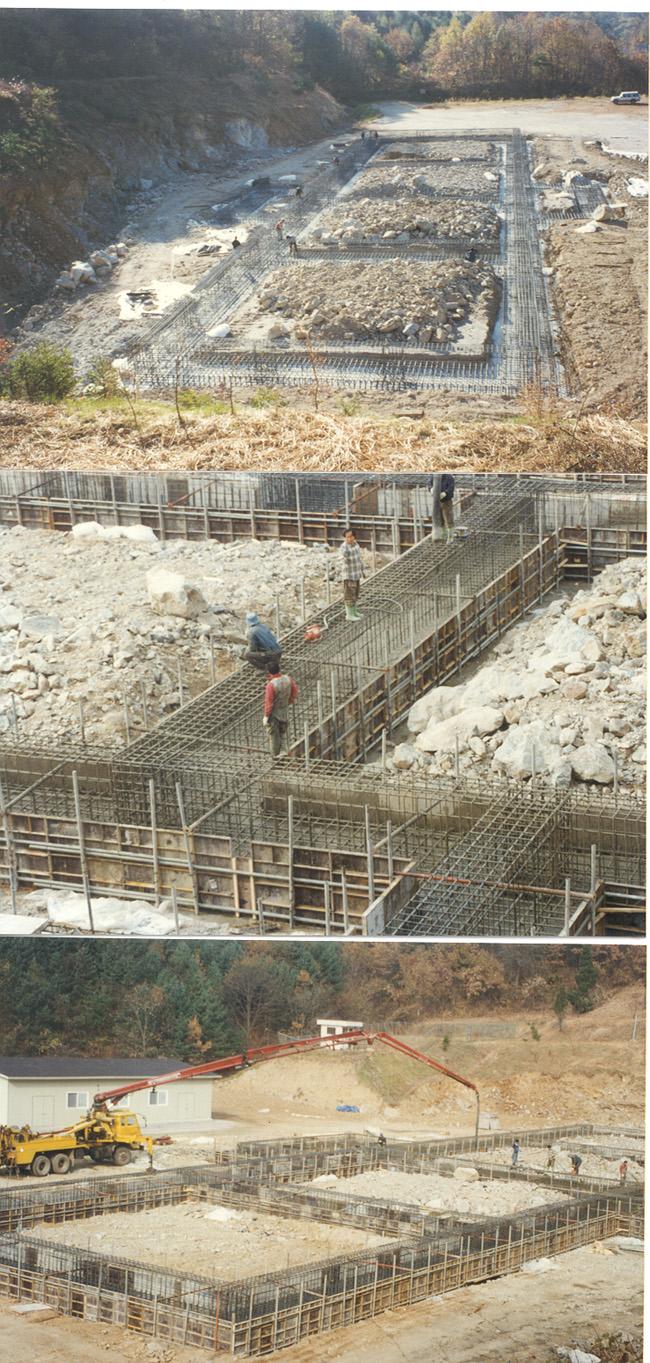 천진암박물관 기초공사 장면 * 건물규모: 1층바닥넓이 450평, 천정높이 5.7m/ 2층 바닥넓이 450평, 천정높이 5.7m/3층바닥넓이 450평, 천정높이 4.2m/4층(추후 필요시 시공)바닥넓이 450평, 천정높이 중심부 4.5m/남북의 길이72m/동서의 길이 32m/건물 높이 22m의 십자형/현재 총 연건평 1,350평(4층이 필요시 추가시공 경우, 총 연건평 1,800평). * 건축자재: 700mmx300mmx20m 철강 H빔 골조/동판 조선개와 지붕/석조 외벽. Columns of iorn H beams are being erected size of H beams is of 700mm large x 300 mm wide x 20m high