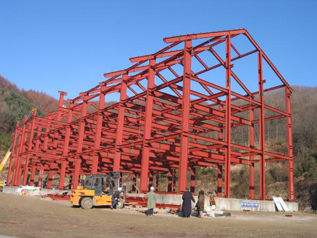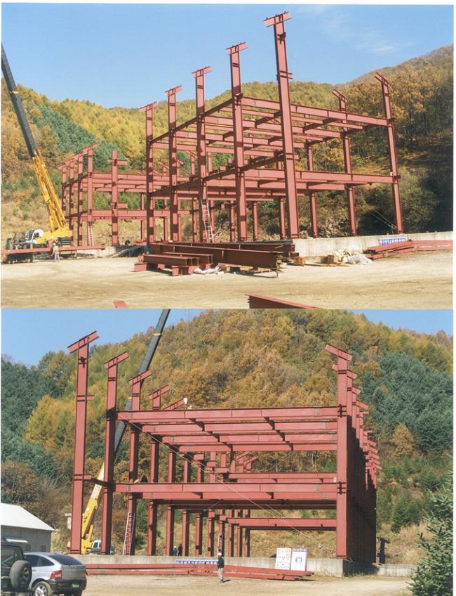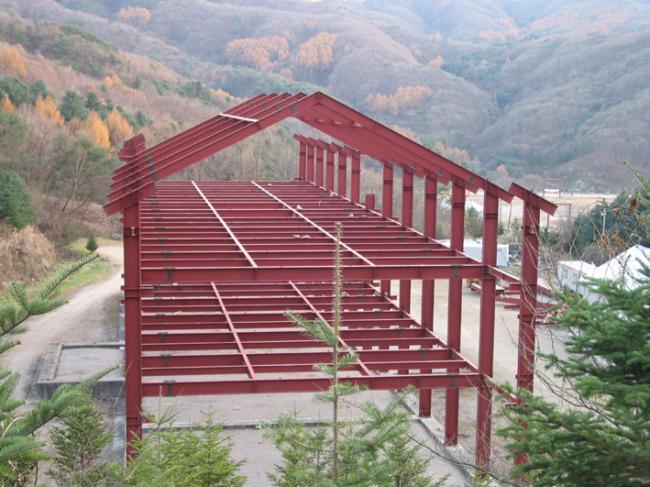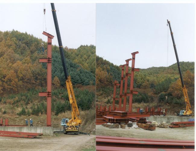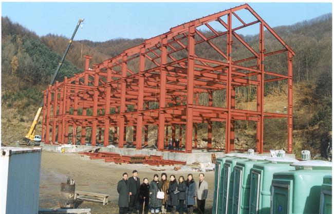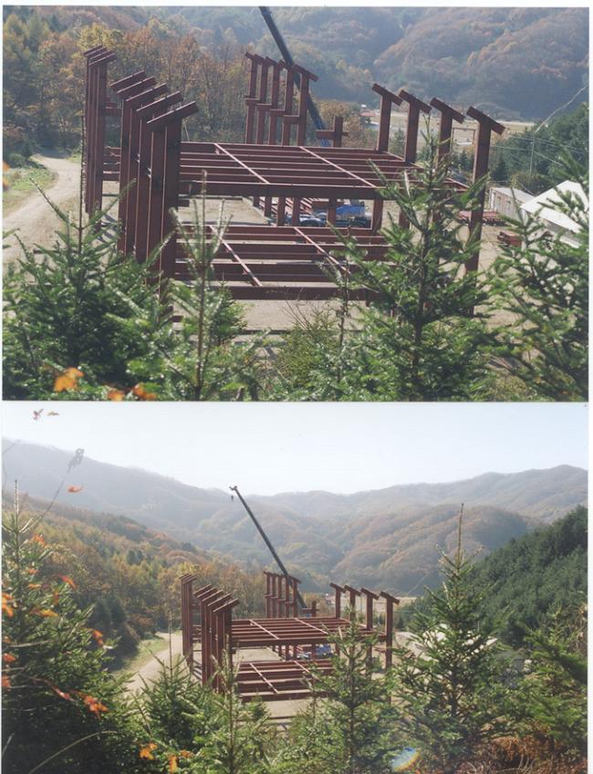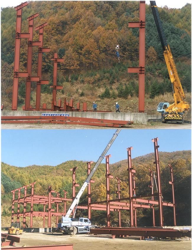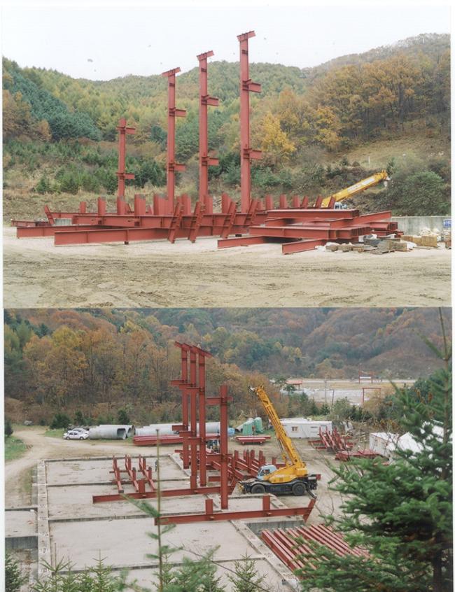 천진암 박물관 철골 지붕공사 장면(산위에서 본 광경) Columns of iorn H beams are being erected size of H beams is of 700mm large x 300 mm wide x 20m high