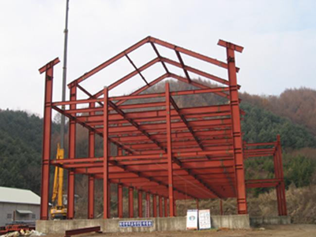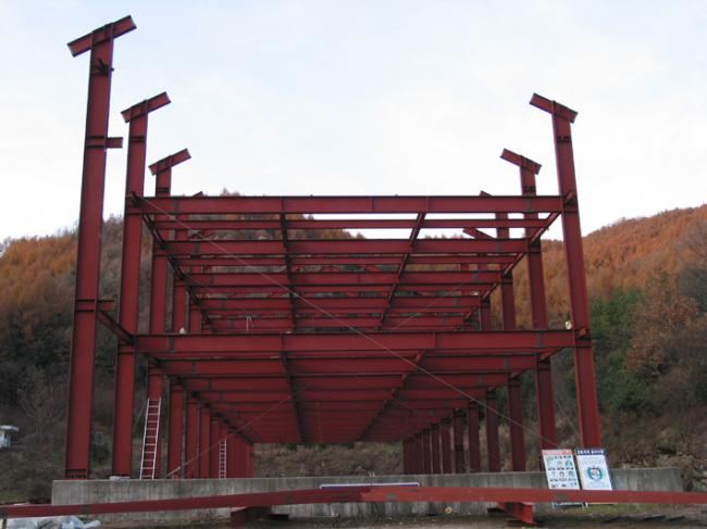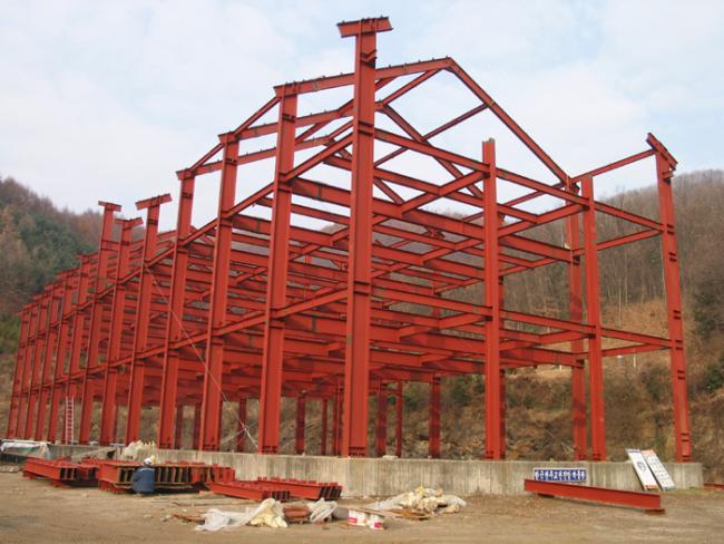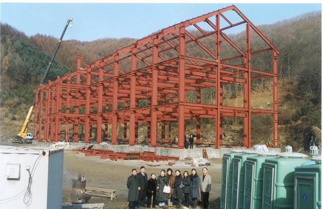 천진암 박물관 철골 지붕공사 장면(정면에서 본 광경) Columns of iorn H beams are being erected size of H beams is of 750mm large x 300 mm wide x 20m high