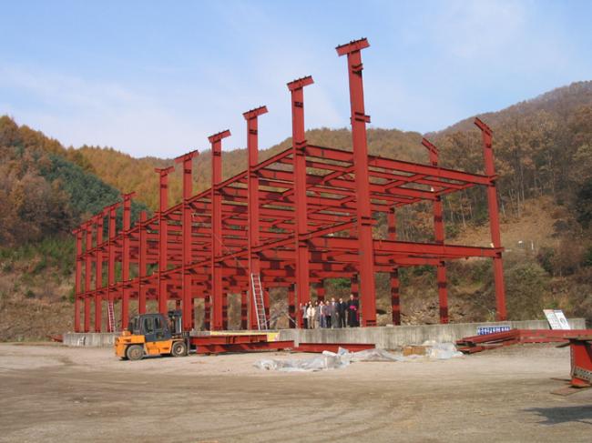 천진암 박물관 철골 지붕 공사 장면 Columns of iorn H beams are being erected size of H beams is of 750mm large x 300 mm wide x 20m high