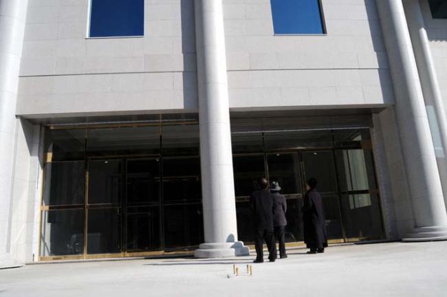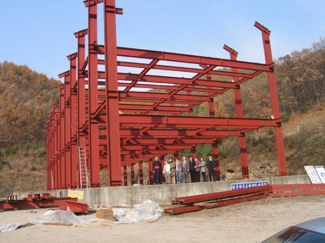 천진암박물관 철골 H빔 공사 장면 * 건물규모: 1층바닥넓이 450평, 천정높이 5.7m/ 2층 바닥넓이 450평, 천정높이 5.7m/3층바닥넓이 450평, 천정높이 4.2m/4층(추후 필요시 시공)바닥넓이 450평, 천정높이 중심부 4.5m/남북의 길이72m/동서의 길이 32m/건물 높이 22m의 십자형/현재 총 연건평 1,350평(4층이 필요시 추가시공 경우, 총 연건평 1,800평). * 건축자재: 750mmx300mmx20m 철강 H빔 골조/동판 조선개와 지붕/석조 외벽. Columns of iorn H beams are being erected size of H beams is of 750mm large x 300 mm wide x 20m high