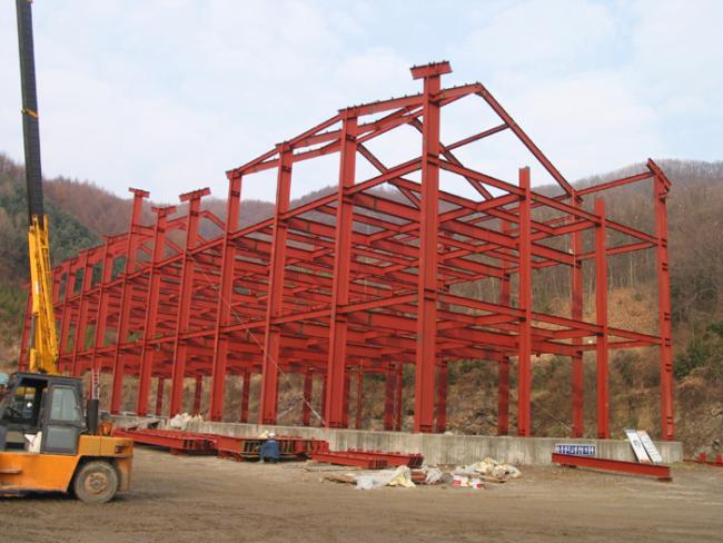 천진암박물관 철골 H빔 공사 장면 Columns of iorn H beams are being erected size of H beams is of 700mm large x 300 mm wide x 20m high