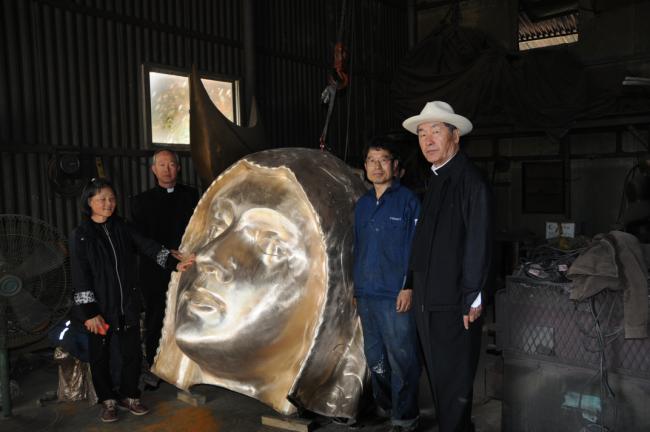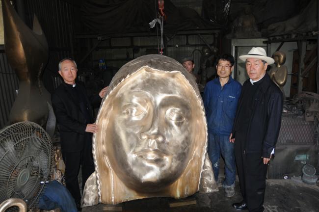 세계 평화의 성모상, 주물 두께 7mm(얼굴) 제작 현장의 기술자와 함께(우측부터 변기영 몬시뇰, 주물공장 유광선 사장, 김학렬 신부)(2013.05.23)