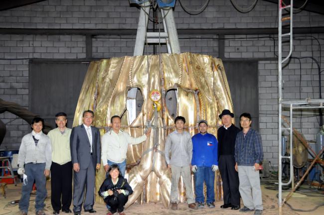 세계 평화의 성모상, 주물 조립 현장 방문, 기술자들과 함께(좌측 네팔 라나씨, 맨 우측부터 주물공장 유광선 사장, 변기영 몬시뇰, 필리핀 Jimbert 도밍고씨, 총 지휘 조선족 김경수씨) (2013.05.23),